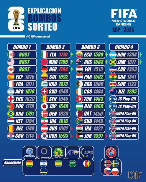 La FIFA dio a conocer el procedimiento del sorteo de la Copa del Mundo el pasado 25 de noviembre. Los tres países anfitriones han sido ubicados en el Bombo 1, junto con las nueve selecciones mejor posicionadas en el ranking FIFA. Estos incluyen a España, Argentina, Francia, Inglaterra, Brasil, Portugal, Países Bajos, Bélgica y Alemania.
